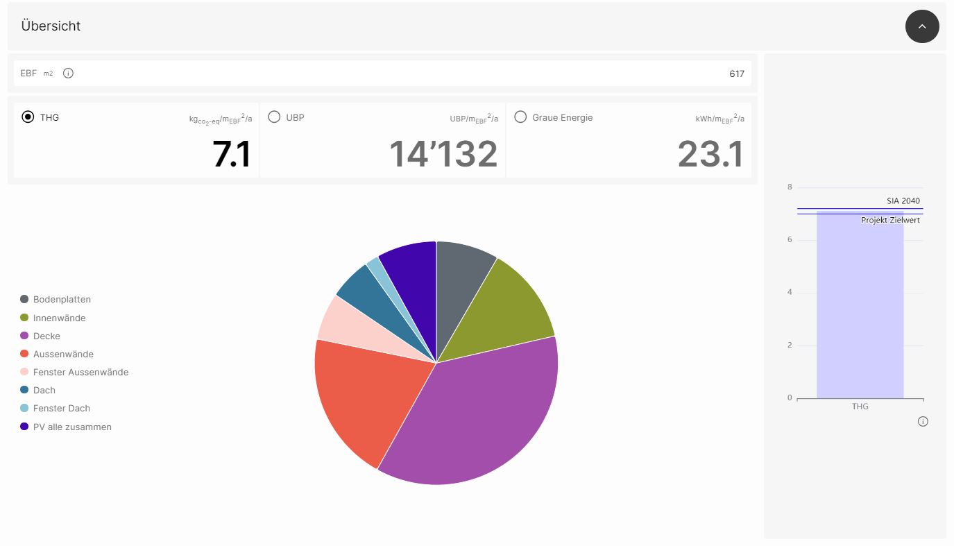 Auf der rechten Seite siehst du ein Balkendiagramm, welches dir deinen projektspezifischen Ökobilanzwert in THG in Bezug zum Projekt Zielwert und dem Zielwert nach SIA 2040 anzeigt. Der Zielwert nach SIA 2040 wird dir nur angezeigt, wenn als Bezugsgrösse EBF gewählt wurde. Grund dafür ist, dass der Zielwert nach SIA 2040 nur mit Bezugsgrösse EBF vorliegt.