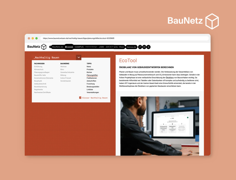 Auf baunetzwissen.de, der Fachplattform des Architekturmagazins BauNetz, wurde EcoTool als neue Entwurfshilfe vorgestellt, die bereits in frühen Projektphasen eine verlässliche Einschätzung der Ökobilanz ermöglicht. Der Artikel zeigt, wie frühzeitige Entscheidungen zu Materialwahl und Konstruktion die Umweltwirkung eines Gebäudes massgeblich beeinflussen können.