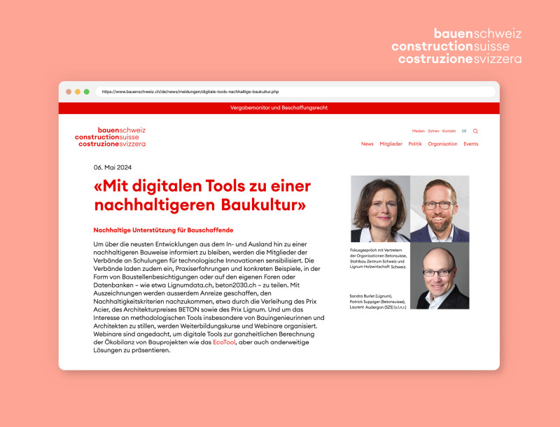 Im Fokusgespräch «Mit digitalen Tools zu einer nachhaltigeren Baukultur» auf bauenschweiz.ch diskutierten Vertreter von Betonsuisse, dem Stahlbau Zentrum Schweiz und Lignum, wie digitale Werkzeuge wie EcoTool die Transformation der Baubranche unterstützen können. Sie betonen, dass die ökologische Qualität eines Projekts schon im Entwurf sichtbar werden muss, um die Netto-Null-Ziele bis 2050 realistisch zu erreichen.