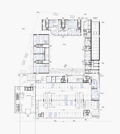Ein wesentlicher Nachhaltigkeitsaspekt des Siegerprojekts ist der weitgehende Erhalt der unterirdischen Baumasse. Anstatt den Bestand komplett rückzubauen, wird die vorhandene Struktur des Untergeschosses in den Neubau integriert. Zusammen mit dem hohen Holzanteil in den Obergeschossen und dem gezielten Einsatz von ReUse-Materialien der ehemaligen Messehalle erzielt das Projekt gute Werte in der Ökobilanz.