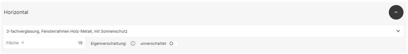 Im Ausklapper "Horizontal" kannst du Angaben zu Dachfenstern vornehmen. Für Dachfenster muss keine Ausrichtung gewählt werden. Du definierst lediglich die Fläche und wählst zwischen unverschattet und teilverschattet. Die Art des Fensters ist bereits aus der Gebäudeoptimierung übernommen, bei verschiedenen Fensterarten kann sie ausgewählt werden.